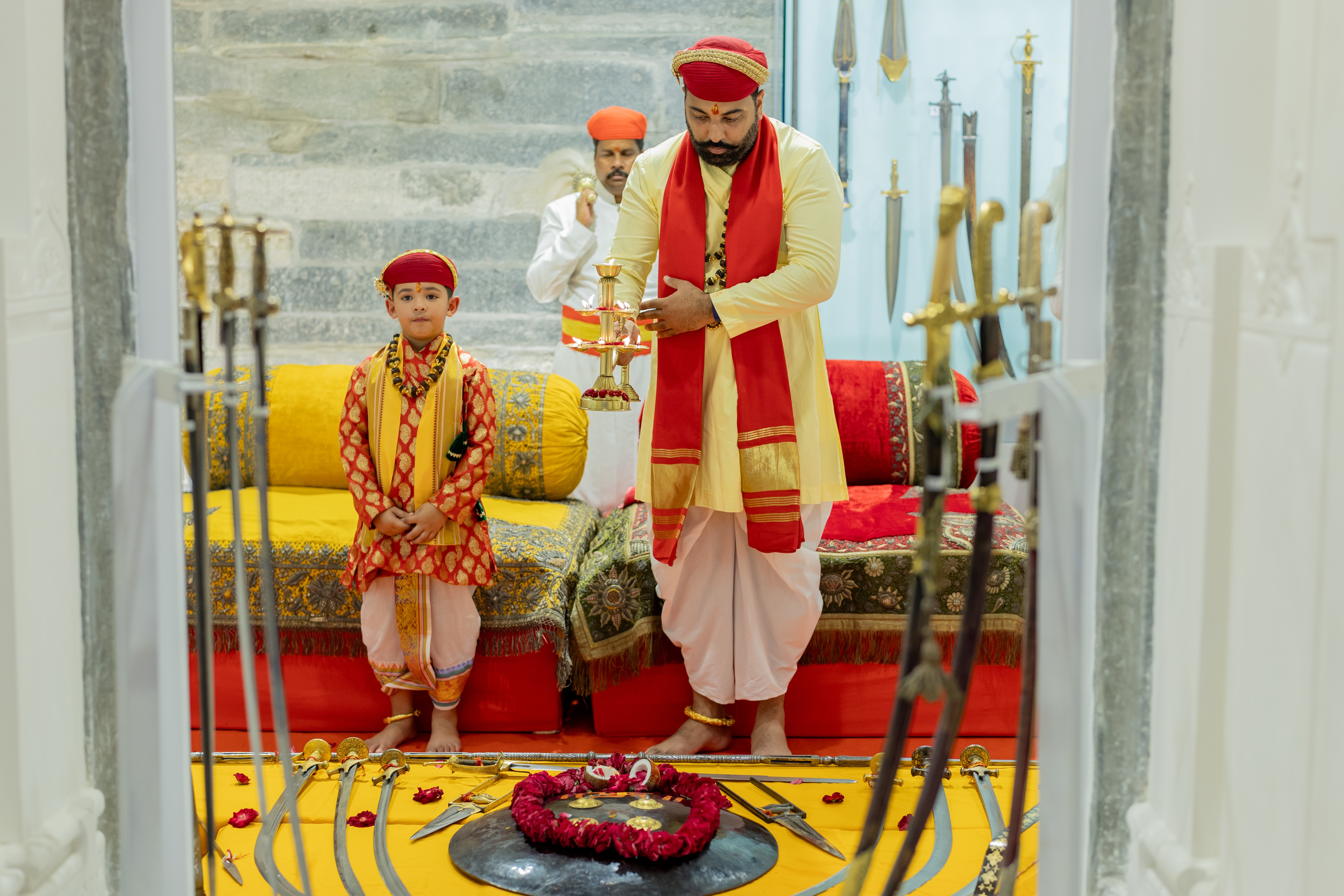 Image Caption: Mr. Lakshyaraj Singh Mewar and Master Haritraj Singh Mewar performing Shastra Poojan