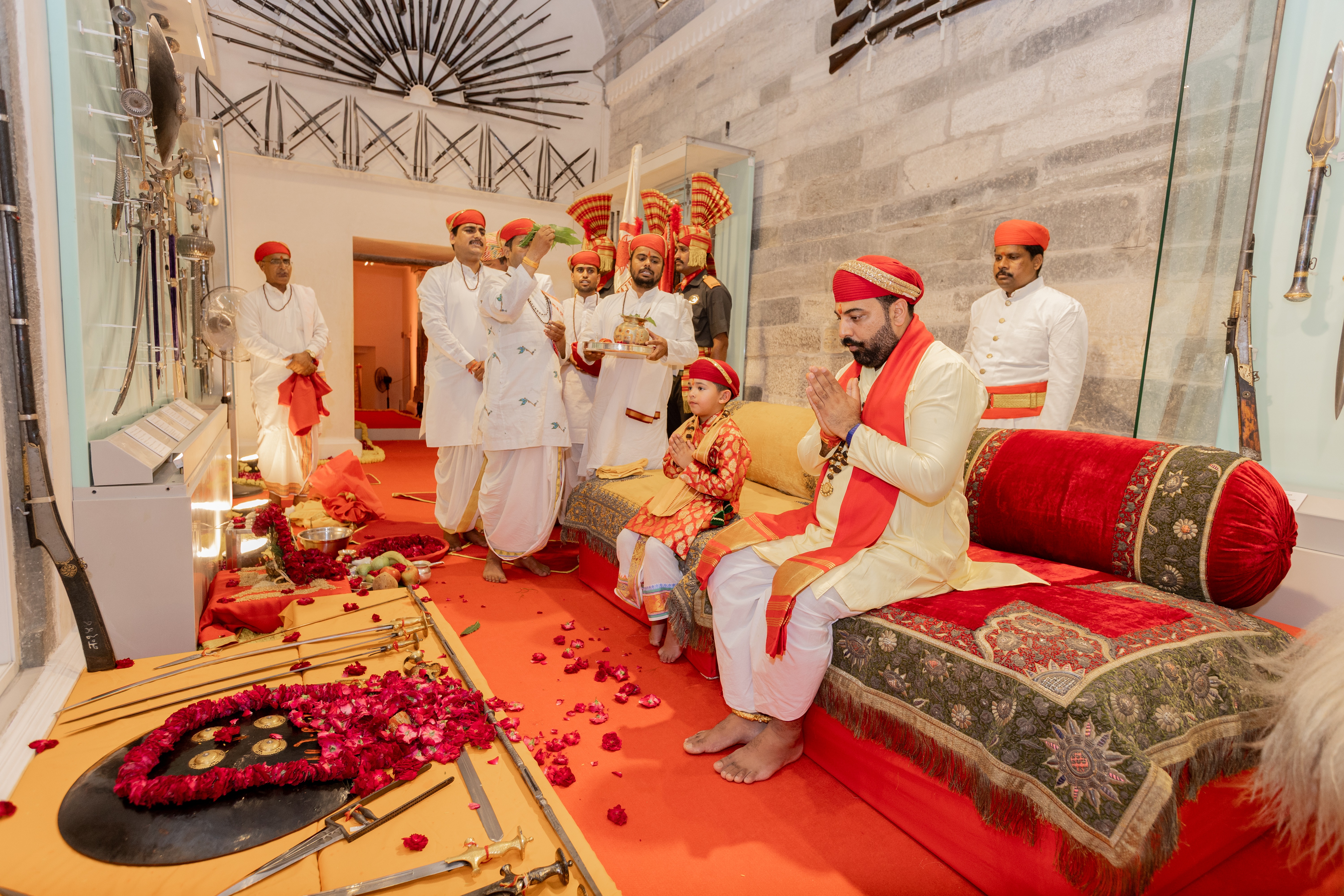 On the occasion of Vijaya Dashami festival, Mr. Lakshyaraj Singh Mewar along with his son Master Haritraj Singh Mewar, worshipped the historical weapons with rituals. Mr. Lakshyaraj Singh Mewar worshipped the weapons with traditional chanting of mantras in the 'Salehkhana' (armory) built during the tenure of Maharana Udai Singh II (r. 1537- 1572) on 12th October 2024.